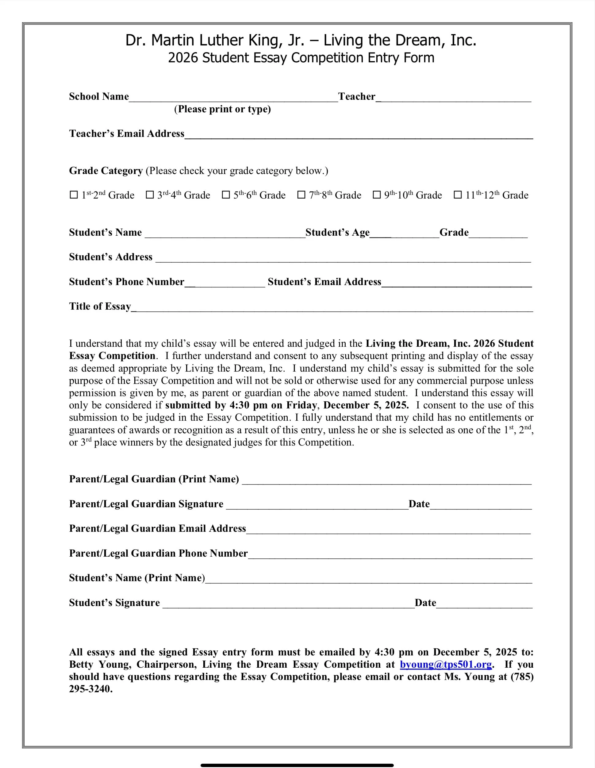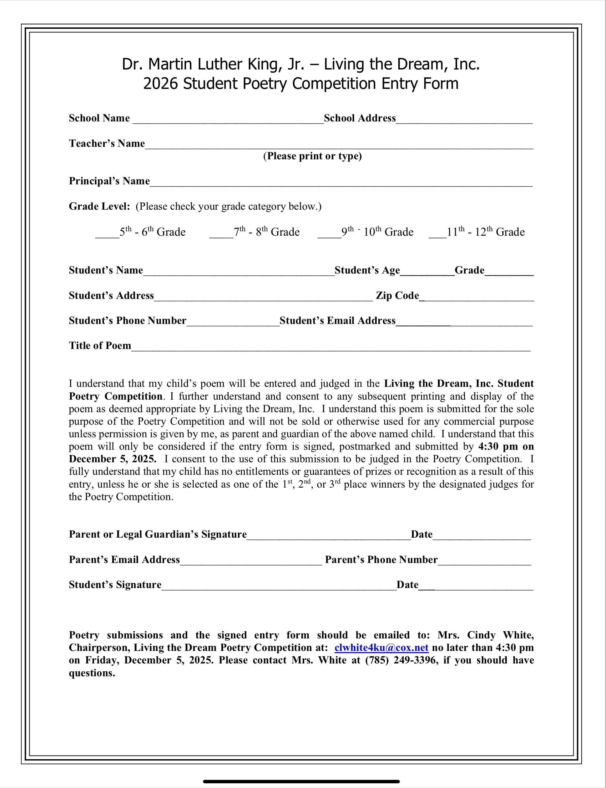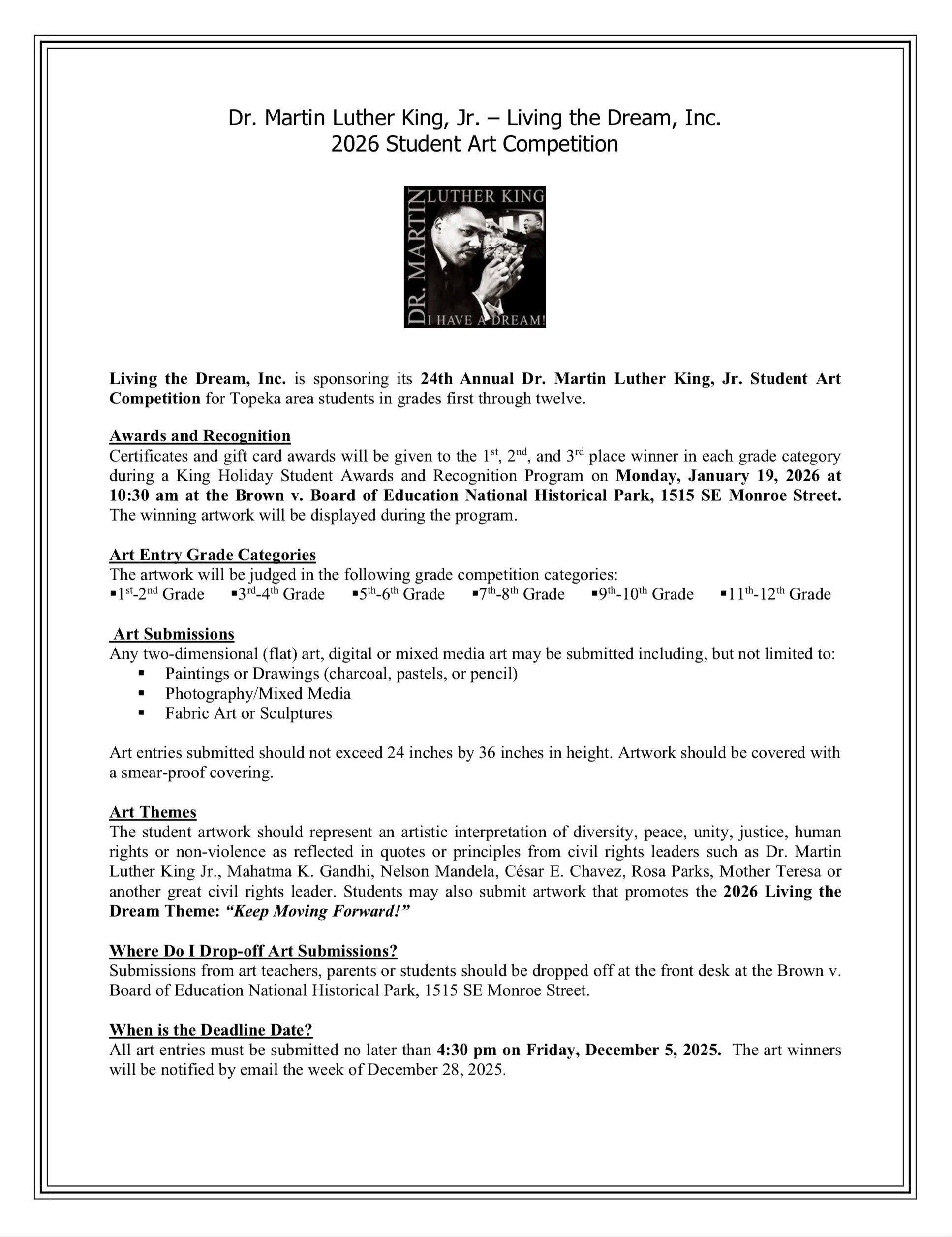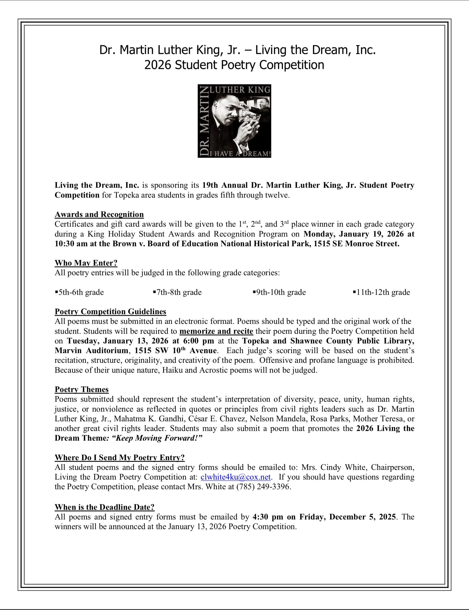 The 17th Annual Dr. Martin Luther King, Jr. Poetry Competition for students in grades fifth through twelfth will be held at 6:00 pm at the Topeka and Shawnee County Public Library, Marvin Auditorium, 1515 SW 10th Street. A reception will follow the program.