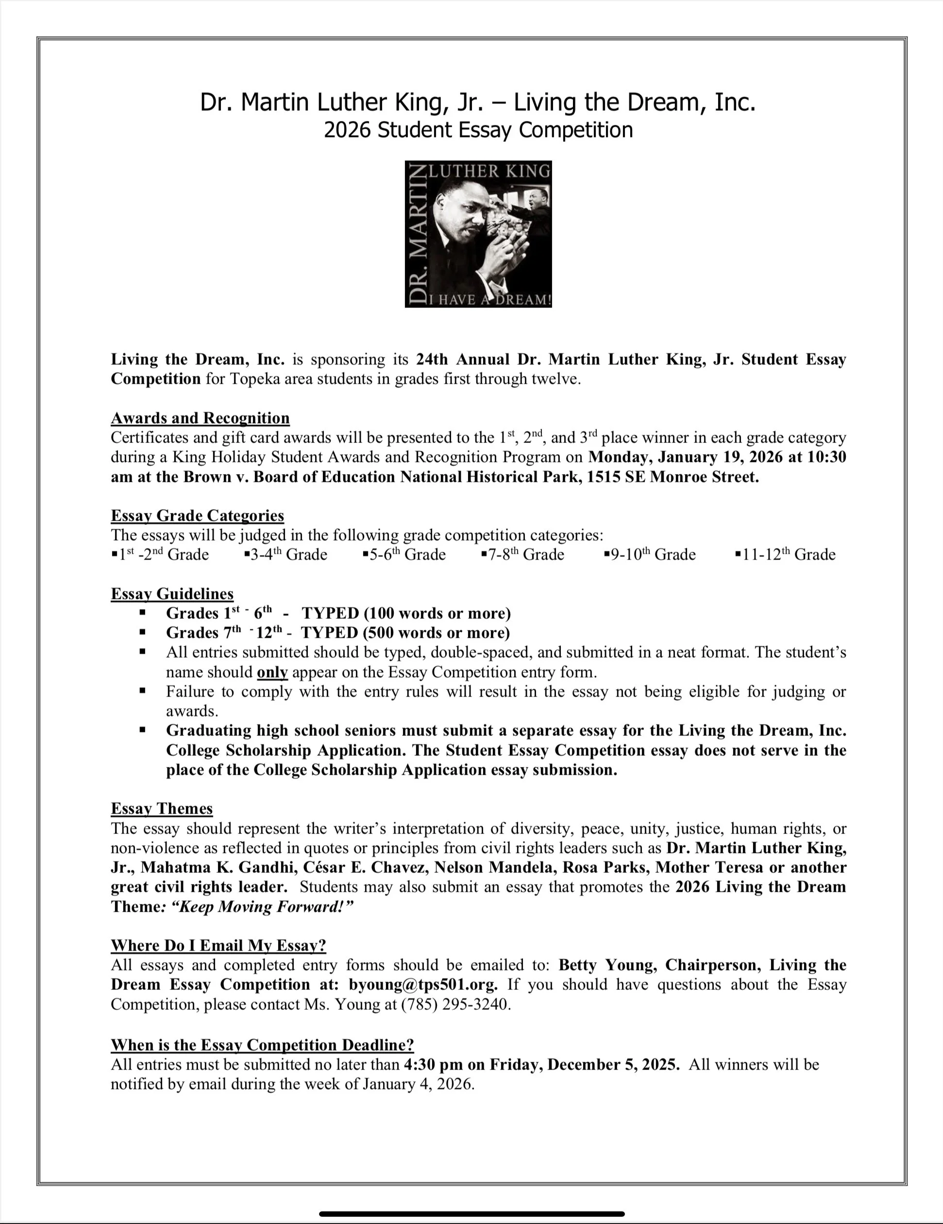 Topeka Public Schools-USD #501 in partnership with Living the Dream, Inc. will be collecting non-breakable and non-perishable food items for community food banks. Donation bins will be placed in all Topeka Public Schools’ buildings.